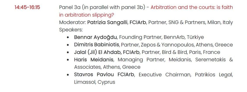 Dr. Haris Meidanis FCIArb, Managing Partner of our Law Firm, participated in the CIArb conference in Athens on April 25, 2025. He had the honor of being a member of an excellent panel, which was engaged in an in-depth discussion, on «Arbitration and the courts: is faith in arbitration slipping? »  moderated by Patrizia Sangalli, FCIArb, Counsel and arbitrator, and co-speakers Bennar Aydogdu, Dimitris Babiniotis, Jalal (Jil) El Ahdab and Stavros Pavlou, FCIArb, BSc (Econ), Barrister, TEP.